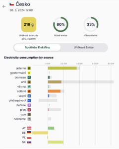 Můžeme se společně podívat na český energetický mix, který lze živě sledovat zde. Pro zjednodušení jsme zde vložili obrázek z března roku 2024, aby ukázal na hodnoty, které jsou relevantní pro jarní období.
